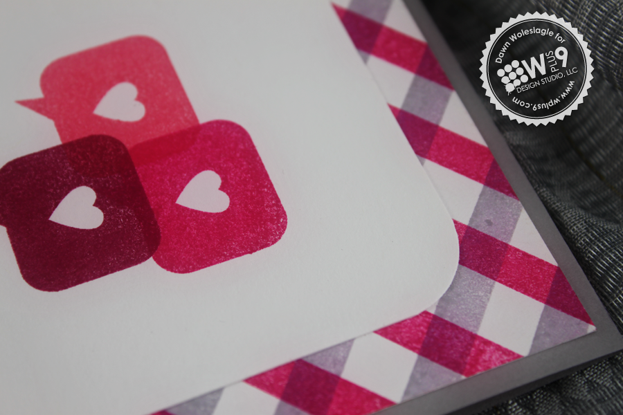 How's that for a punch of color? Here, I used the solid stripe from Country Charm to create a plaid background. I simply stamped a series of stripes on the diagonal in gray, and then again in pink in the opposite direction.
